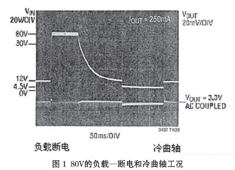 “冷曲軸”(cold crank)段,發(fā)生在汽車發(fā)動機(jī)經(jīng)受冷卻或凝固期間,發(fā)動機(jī)油變的非常粘滯。因而要求起動機(jī)輸出更大的轉(zhuǎn)矩,相繼需要蓄電池提供更大的電流。這一大的電流負(fù)載導(dǎo)致蓄電池/一次母線的電壓降低,甚至低于4V的點火電壓。隨后,又回復(fù)至額定電壓13.8V(圖1)。這在某些應(yīng)用場合,例如發(fā)動電機(jī)控制、安全系統(tǒng)和導(dǎo)航系統(tǒng)均不可避免。故要求具有良好調(diào)節(jié)的輸出電壓(一般為3.3V)貫穿“冷曲軸”段,以實現(xiàn)全過程的無間斷(連續(xù))運行。
