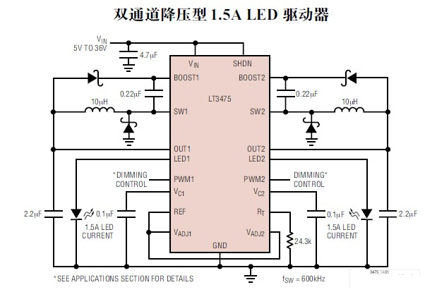 LTC3475以其寬的輸入電壓范圍(4V~36V,max40V),可調(diào)節(jié)含汽車動力系統(tǒng)在內(nèi)的廣闊的電源陣列。它的開關(guān)頻率調(diào)節(jié)幅度為200kHz~2MHz,能利用很小的電感器和陶瓷電容器,與耐熱的TSSOP-16組件結(jié)合,在驅(qū)動2個或4個大電流LED時,可提供結(jié)構(gòu)非常緊湊的解決方案。