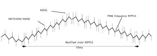 --工頻噪聲(Recfified main RIPPLE),一般是交流供電頻率的兩倍。我國供電頻率是50Hz,所以它的紋波主要來自工頻50Hz變壓器。大小取決于整流電路的類型。對于半波整流,50Hz;對于全波整流,是100Hz;對于三相全波整流,300Hz。