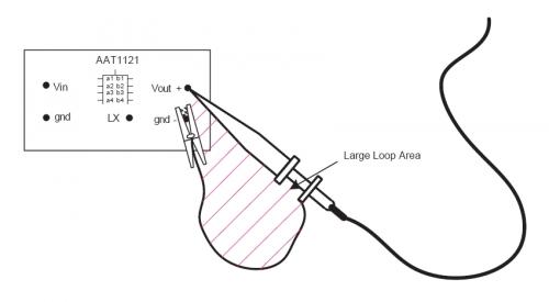 下圖是一個錯誤的測量方式,因為示波器的地線會拾取輻射噪聲。示波器的地線和信號探頭形成的環路形成了一個天線。環路面積越大,在電源PWM切換時,示波器接受到的開關噪聲就越大。