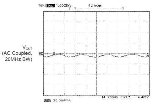 下圖是采用20MHz帶寬限制測試到的電源的紋波以及噪聲。示波器20MHz的帶寬限制是為了防止無源探頭帶入的共模噪聲。可以看到AAT1121BUCK轉換器的紋波噪聲為10mVp-p,幾乎看不到開關噪聲。這主要是歸功于BUCK控制器的低噪聲設計,良好的PCB設計,以及恰當的測試方法。