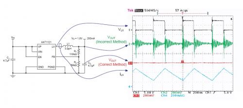 下圖描述了采用兩個不同的測試方法得到的Vout波形。電源電路是一個BUCK轉換電路(AAT1121),工作在1.5MHz的開關頻率,輸出電壓為1.8V/250mA。示波器采用全帶寬測試。可以看到伴隨著PWM開關,在綠色的trace2有一個很高的噪音以及振鈴,但是trace3上卻沒有明顯的噪聲。通過對比可以看到,測試方法的選擇對結果的準確性很關鍵。