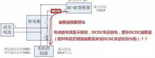 電機控制器的電容出了問題,不足負載需求,需要快速充電時DC/DC內的電容放電了(電流往回走),所以導致這個熔斷器損壞。