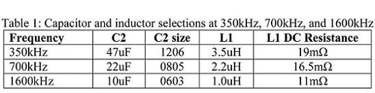 表格1:頻率分別為350kHz, 700kHz,和1600 kHz時的電容器和感應器選項