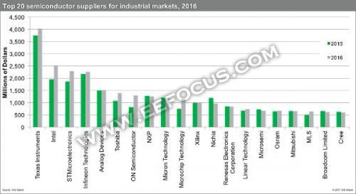 在預(yù)測(cè)2017年經(jīng)濟(jì)狀況繼續(xù)改善的同時(shí),IHS Markit列出了以市場(chǎng)份額排名的工業(yè)半導(dǎo)體市場(chǎng)前20強(qiáng)。