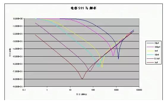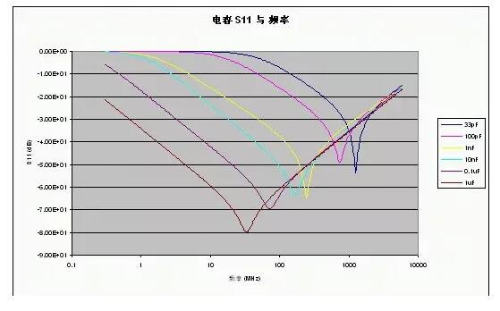 給出了不同容值下的典型S11參數(shù),從這些曲線(xiàn)可以清楚地看到SRF,還可以看出電容越大,在較低頻率處所提供的去耦性能越好(所呈現(xiàn)的阻抗越低)。