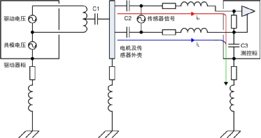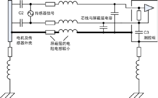 4)此處電機(jī)平臺和測控柜已有接地,通過傳感器連接線屏蔽層又將兩者連接,形成地環(huán)路。然而實(shí)際工程應(yīng)用中地環(huán)路往往不可避免地存在,本例中若沒有屏蔽層依然會通過C2、電纜和C3產(chǎn)生高頻地環(huán)路,從這方面看屏蔽層改變了環(huán)路路徑。