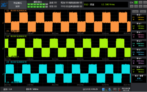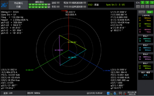此時將系統(tǒng)運(yùn)行起來,通過功率分析儀的數(shù)據(jù)和波形再次進(jìn)行驗(yàn)證,電壓波形圖和矢量圖都很完美。