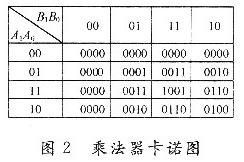 兩位乘法器能夠?qū)崿F(xiàn)2位二進(jìn)制數(shù)的乘法運(yùn)算,設(shè)A1A0,B1B0為乘數(shù)和被乘數(shù),P3P2P1P0為乘法運(yùn)算得到的積,由卡諾圖(見圖2)得到兩位乘法器的輸出邏輯函數(shù)表達(dá)式分別為: