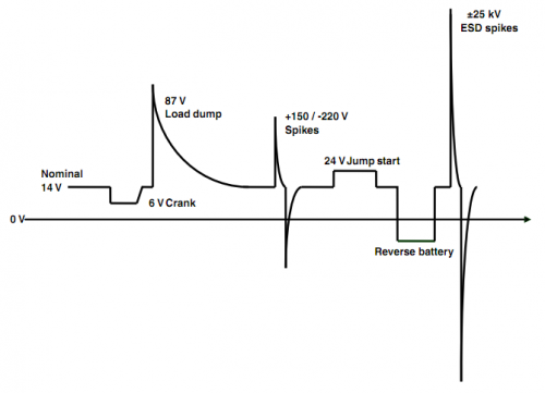 最有威脅的電壓瞬變是由拋負(fù)載和跳啟動引起的電壓瞬變,但所有其他危害都可能影響電子模塊的正常運(yùn)行。
