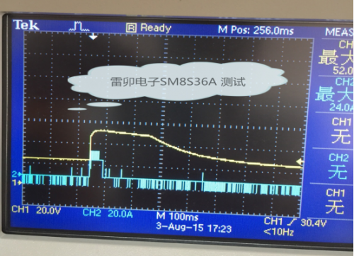 Vcl=36.5V 表示增加了TVS后端電路的電壓曲線,看得出電壓得到有效的抑制,確保后端芯片不會損壞;