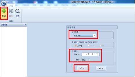 第一打開軟件,新建一個設備類型,選擇對應機器型號,如僅進行離線分析,則無需設置IP信息;