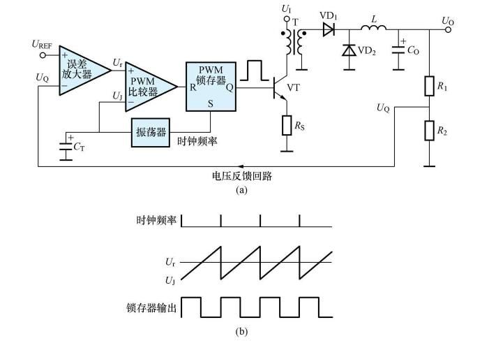 電壓控制是開關電源最常用的一種控制類型。以降壓式開關穩壓器(即Buck變換器)為例,電壓控制型的基本原理及工作波形分別如圖1 (a)、(b)所示。其特點是首先通過對輸出電壓進行取樣(必要時還可增加取樣電阻分壓器),所得到的取樣中壓UQ就作為控制環路的輸入信號。然后對取樣電壓和基準電壓UREF進行比較,并將比較結果放大成誤差電壓Ur,再將Ur送至PWM比較器與鋸齒波電壓Uj進行比較,獲得脈沖寬度與誤差電壓成正比的調制信號。圖1 (a)中的振蕩器有兩路輸出,一路輸出為時鐘信號(方波或矩形波),另一路為鋸齒波信號, CT為振蕩電容。T為高頻變壓器,VT為功率開關管。降壓式輸出電路由整流二極管VD1、續流二極管VD2、儲能電感L和濾波電容Co組成。PWM鎖存器的R為復位端,S為置位端。